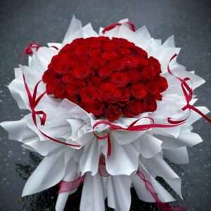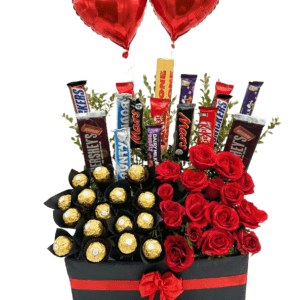 A timeless duo designed to make a lasting impression. This elegant set pairs a lush bouquet of vibrant red roses with a charming wooden tray filled with favorite chocolates. Wrapped in delicate white tulle and finished with signature red bows, it’s the perfect balance of romance and sweetness.